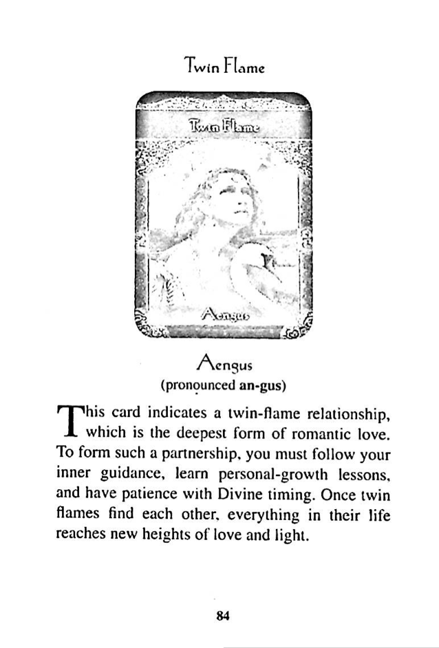 앵거스는 소울메이트와 트윈 플레임이 만나 조화로운 관계를 즐길 수 있도록 돕는 켈트 신입니다. 트윈 플레임은 소울메이트 관계보다 더 긴밀하고 영원한 형태입니다. 그는 마법의 하프 음악과 치유의 키스로 연인들의 다툼을 해결해줍니다. 앵거스는 카이어라는 아름다운 소녀를 처음 보고 깊이 사랑에 빠졌습니다. 그는 은으로 만든 사슬에 묶여 백조가 되어버린 카이어를 따라갔고, 영원히 그녀의 트윈 플레임과 함께하기 위해 백조로 변신했습니다. 앵거스를 불러 당신의 소울메이트나 트윈 플레임을 만나고, 사랑의 관계에서 생길 수 있는 갈등을 해결하세요.