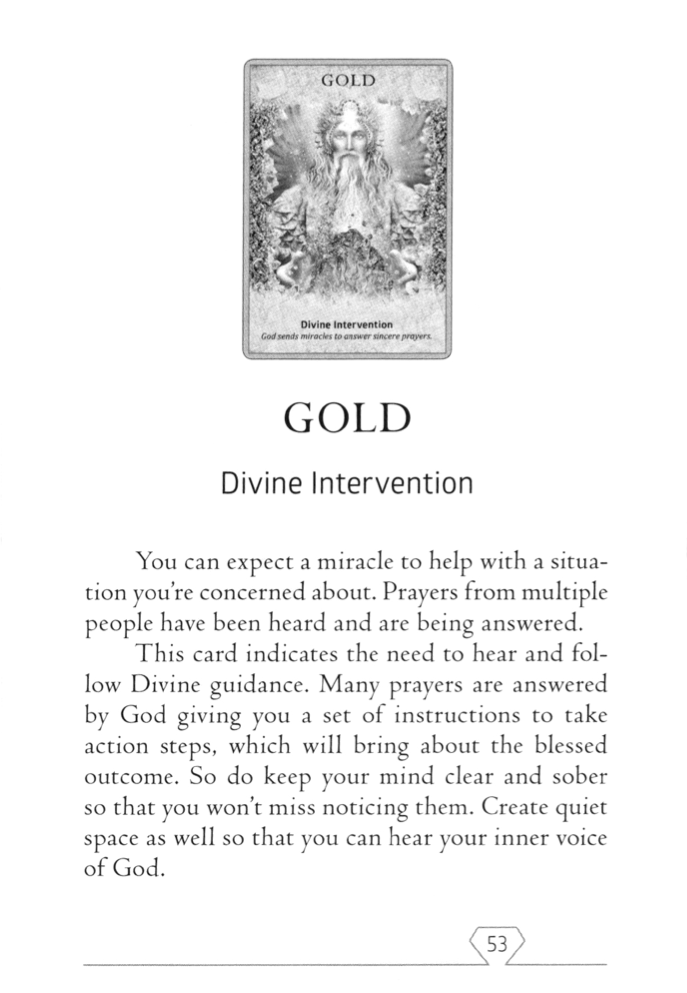 About Gold: This precious elemental metal is considered valuable because of its relative rarity and its malleability, which makes it soft enough to easily transform into jewelry. Scientists believe that gold arrived on the earth from asteroids. While technically an element rather than a crystal, gold (like copper, which is also featured in this deck in the form of azurite and malachite) is both symbolic of the Divine and an amplifier of prayers and intentions. Gold is also the energy aura color of Jesus Christ.