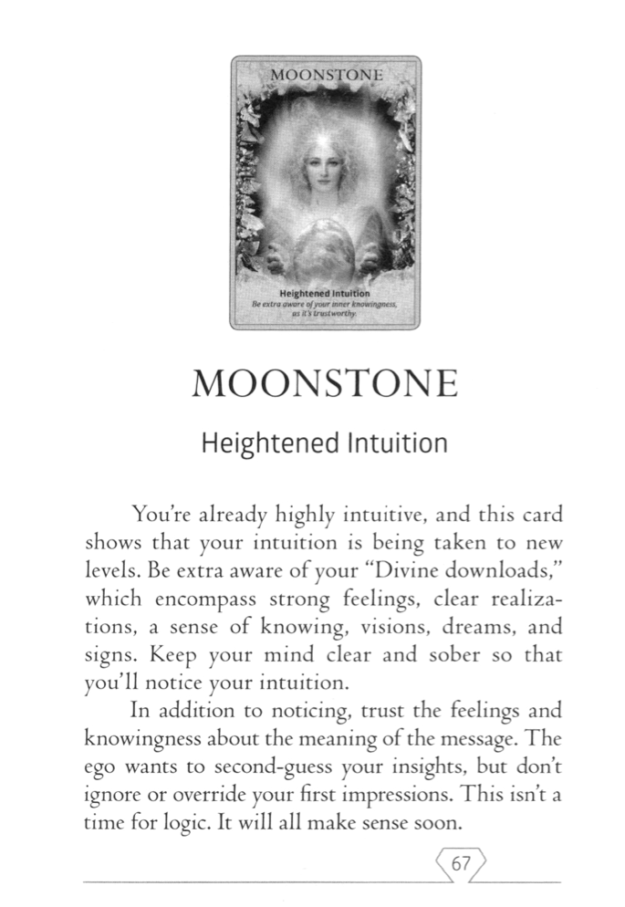 이미 당신은 직관력이 뛰어난 사람입니다. 이 카드는 당신의 직관력이 새로운 차원으로 상승하고 있음을 보여줍니다. 강한 느낌, 명료한 깨달음, 알고 있음의 감각, 비전, 꿈, 그리고 다양한 신호들로 이루어진 '신성한 다운로드'에 더욱 주의를 기울이세요. 마음을 맑고 깨어있게 유지하여 직관을 놓치지 않도록 하세요.