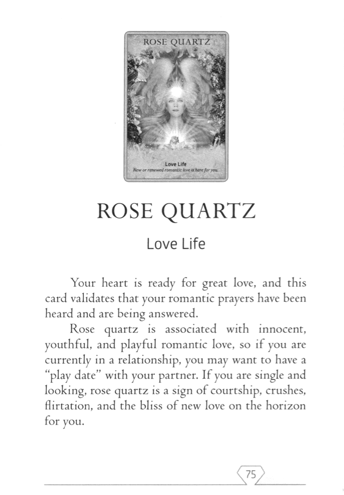 당신의 마음은 위대한 사랑을 받아들일 준비가 되었습니다. 이 카드는 당신의 로맨틱한 기도가 들렸으며, 그에 대한 응답이 오고 있음을 확인해 줍니다. 로즈 쿼츠는 순수하고 젊은 날의 사랑, 그리고 장난기 어린 사랑과 밀접한 관련이 있습니다. 만약 현재 연인 관계에 있다면, 파트너와 함께 즐거운 시간을 가져보세요. 싱글이라면, 로즈 쿼츠는 당신에게 구애와 설렘, 새로우면서도 행복한 사랑이 다가오고 있다는 신호입니다.