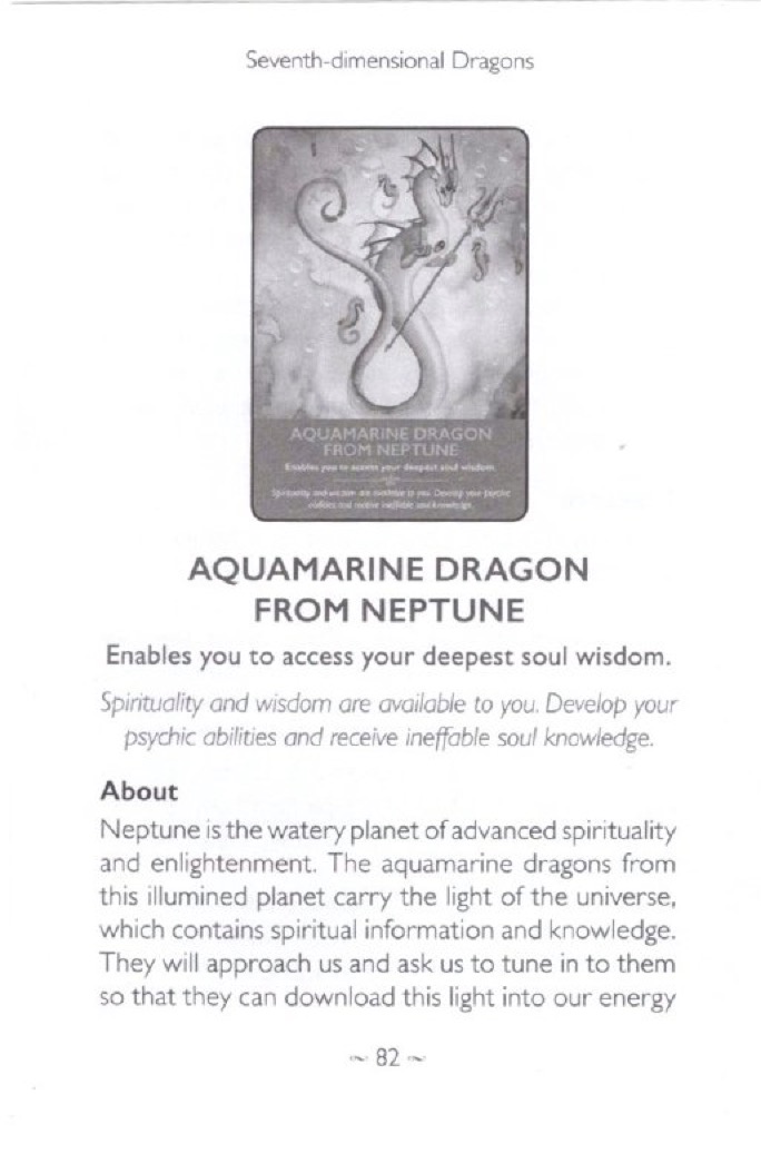 Neptune is the watery planet of advanced spirituality and enlightenment. The aquamarine dragons from this illumined planet carry the light of the universe, which contains spiritual information and knowledge. They will approach us and ask us to tune in to them so that they can download this light into our energy fields. This will enable us to take information and know how to apply it wisely.