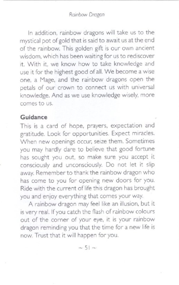 Cocoons you so that your divine potential grows. Meditate. Reflect. Undergo a metamorphosis. About Fifth-dimensional black dragons are powerful. They only come to us when we are ready to nurture a new idea or concept that will enable our divine potential to grow. Black is the ultimate divine feminine colour, the shade of mystery and magic, of secrets and hidden hopes. When we are prepared to surrender to the black dragons, they will cocoon us in silky black energy, and as we rest within this safe, dark place, they will enable the new to develop within us. Eventually we will emerge, like a butterfly, having undergone a profound metamorphosis. Guidance Choosing this card suggests it is time to rest, for it is during such moments of relaxation that divine projects, creative ideas or a new way of thinking are conceived. In times of peace and stillness, fresh seeds and ideas can grow. The mighty black dragons wish to create a dark cocoon for you now so that the new can germinate and sprout. You are asked to accept their assistance, for it will serve your spiritual growth. Take time to meditate or reflect and the dragons will surround you with their breath. This will allow the opportunity that is being presented to you to take root. When you are ready, the black dragons will help you to nurture the new growth. Ask them to help you hold your vision until it comes to glorious fruition. They will also be working with you in your sleep state and you may be aware of their presence, so acknowledge their help. Expect to be different and be ready to spread your wings.