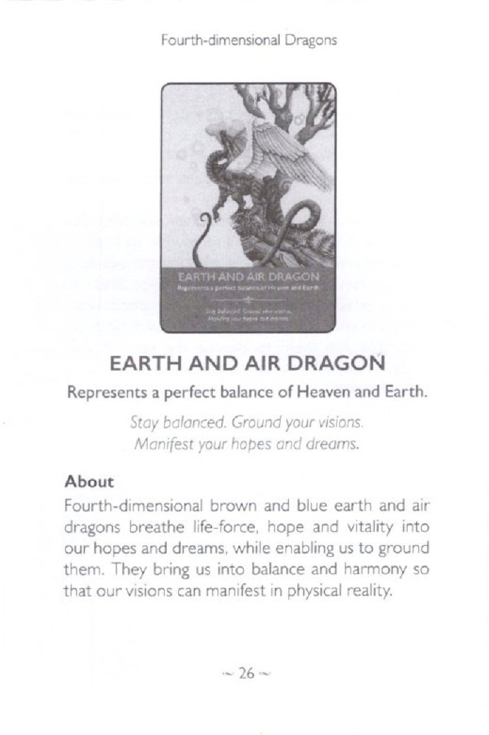 사차원의 갈색과 파란색 대지와 공기의 드래곤들은 우리 희망과 꿈에 생명력과 희망, 활력을 불어넣으면서 그것들을 현실로 뿌리 내리게 합니다. 그들은 우리를 균형과 조화로 이끌어 비전을 물질 세계에 실현할 수 있도록 돕습니다. 이를 위해 우리는 먼저 하늘의 성을 그려보고 땅에 뿌리를 내립니다. 이 찬란한 드래곤들은 이 과정을 도와줍니다.