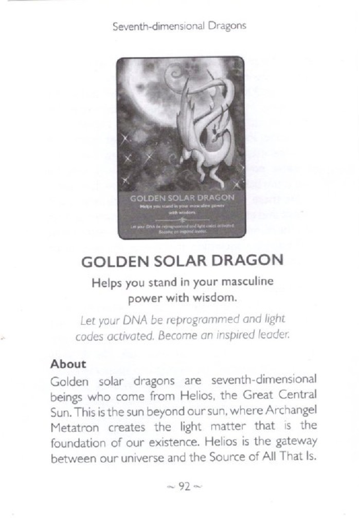 Helps you stand in your masculine power with wisdom. Let your DNA be reprogrammed and light codes activated. Become an inspired leader. About Golden solar dragons are seventh-dimensional beings who come from Helios, the Great Central Sun. This is the sun beyond our sun, where Archangel Metatron creates the light matter that is the foundation of our existence. Helios is the gateway between our universe and the Source of All That Is. The golden solar dragons from Helios touch us with divine masculine energy. They infuse us with courage, strength, logic, leadership and the qualities of the peaceful warrior. They then balance this with golden wisdom, all at a much higher frequency than we are used to. Working in harmony with the silver lunar dragons, they are activating us all now, illuminating the DNA within us that has been dormant since the fall of Atlantis. We are being intensively reprogrammed in preparation for the new Golden Age. Guidance The golden solar dragon who has come to you now is asking you to balance your life, listen to your inner wisdom and become a leader. Dare to speak your spiritual truth. Hold the vision of a fifth-dimensional world. Protect those who are less capable than you are. With the support and guidance of this dragon, you can be a living example to many people. When you aspire to be a wise spiritual leader, remember that true masculine power, used with wisdom, helps you and those around you to feel safe. Spend a little time each day focusing on, or imagining, the sun shining onto your third eye and sense the light codes that the golden solar dragons are directing towards you.
