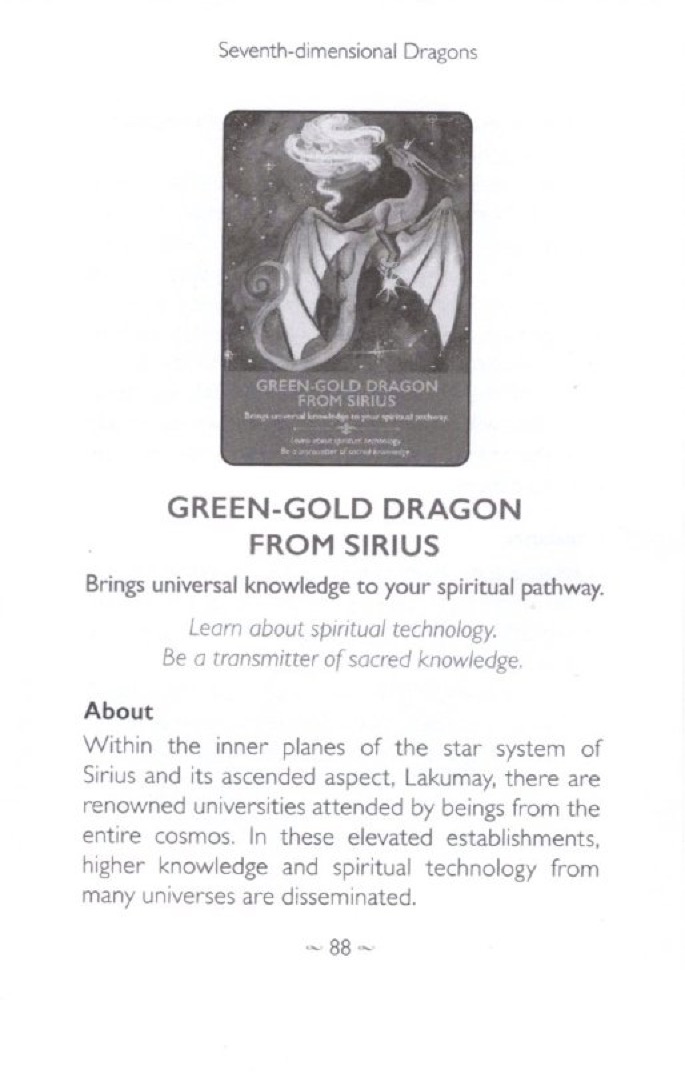Brings universal knowledge to your spiritual pathway. Learn about spiritual technology. Be a transmitter of sacred knowledge. About Within the inner planes of the star system of Sirius and its ascended aspect, Lakumay, there are renowned universities attended by beings from the entire cosmos. In these elevated establishments, higher knowledge and spiritual technology from many universes are disseminated. These magnificent dragons work in these academies of light, and carry the keys and codes of the spiritual technology of the future in their energy fields. Their mission is to spread this to all those who are ready, to help bring in the new Golden Age. These dragons are cosmic travellers and, like all dragons, help us to move through the dimensions. In addition, they will guide and protect us on our inter-dimensional journeys between Earth and other parts of the universe, especially if we aspire to be an intergalactic master. Guidance Drawing this card suggests you invite these luminous beings to swirl round you, touching your chakras with the sacred geometry of the universe. Then ask them to tune you in to any aspect of higher knowledge you can bring forward now. Sit quietly and allow this to happen. You may receive a download of information, or various keys and codes you carry in your soul may light up. If so, you will become a transmitter who broadcasts sacred knowledge, though you may not be consciously aware of it. This is a very powerful dragon, so notice subtle changes in your thoughts and attitudes. Your dreams may reveal memories from your travels with the wonderful green-gold dragons from Sirius.