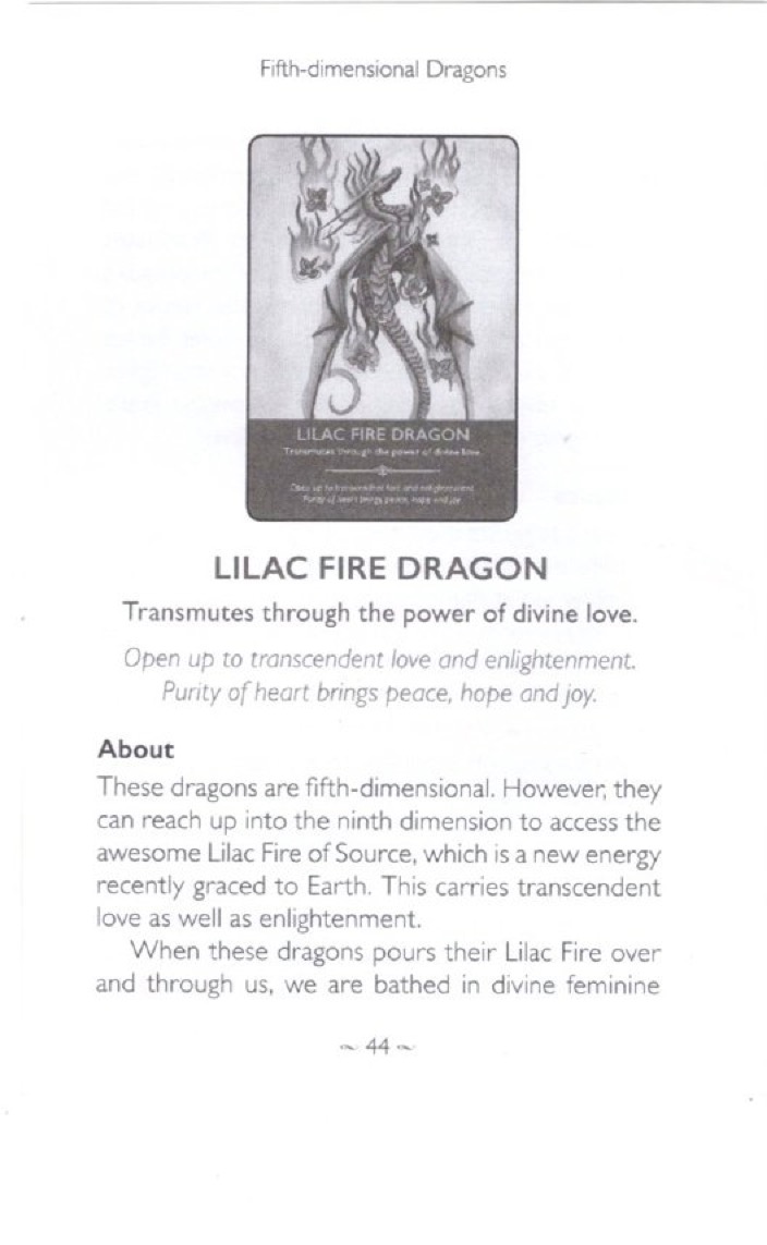 Transmutes through the power of divine love. Open up to transcendent love and enlightenment. Purity of heart brings peace, hope and joy. About These dragons are fifth-dimensional. However, they can reach up into the ninth dimension to access the awesome Lilac Fire of Source, which is a new energy recently graced to Earth. This carries transcendent love as well as enlightenment. When these dragons pour their Lilac Fire over and through us, we are bathed in divine feminine light, which has the power to dissolve all lower energies in pure love and bring us peace, hope and joy. It also bathes us in the higher divine feminine qualities of wisdom, agape and oneness. Having this energy in our aura may even allow us to experience bliss and ecstasy. Guidance When you choose this card, a Lilac Fire dragon will touch you with incredible ninth-dimensional light. So call it in and ask it to touch you. As it approaches you, breathe in divine love and sense the Lilac Fire enveloping you. This will enable you to let go of the old easily, calmly and graciously. Notice particularly how you feel when this dragon touches you and sense the purity of the love that it radiates. Ask this dragon to remain with you to anchor the glorious light of the Lilac Fire and take you into a new and illumined way of being. When you do this, the love radiating from your heart will become purer and more beautiful. People will sense this and respond with trust, respect and gratitude. Consciously work with this beautiful dragon and notice the difference it makes to your life and the quality of love around you.
