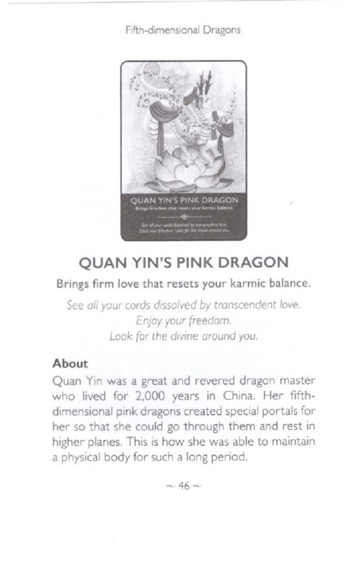 당신의 업장을 다시 세우는 단단한 사랑을 전해드립니다. 뛰어난 사랑으로 모든 관계의 끈들이 사라지는 것을 보세요. 자유로움을 만끽하세요. 주변에서 신성을 찾아보세요. 관음은 2,000년 동안 중국에서 위대한 용의 스승으로 존경받았습니다. 그녀의 5차원 분홍 용들은 특별한 차원의 문을 열어 그녀가 그곳을 지나 높은 차원에서 쉴 수 있도록 해주었습니다. 이는 그녀가 오랜 세월 육체를 유지할 수 있었던 비결이었습니다. 관음의 용들은 가장 아름답고 연한 색상의 분홍빛을 띠며, 신성한 자궁의 차크라처럼 빛납니다. 이 용들은 우리가 이 생애에서나 다른 생애에서, 어떤 차원 혹은 존재의 평면에서도 다른 이들과 연결되어있는 모든 끈에 초월적인 사랑을 쏟아부어 은혜의 법 아래 모든 업장을 녹여줍니다.