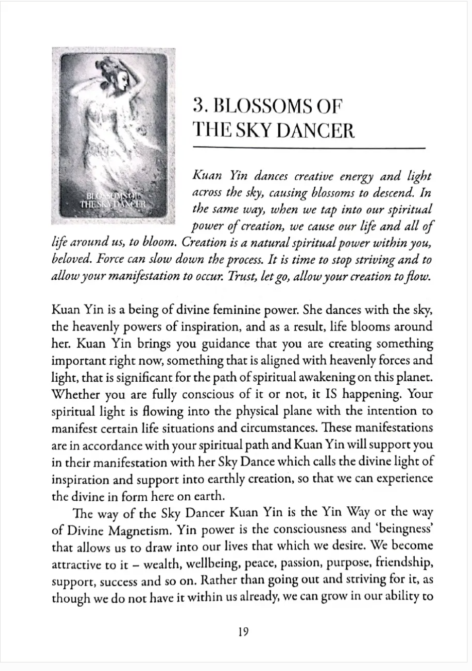 하늘 무희 관음의 길은 음의 방식, 혹은 신성한 자성을 따르는 길입니다. 음의 힘은 우리가 원하는 것을 우리의 삶으로 끌어들이게 해주는 의식과 '존재함'입니다. 우리는 부, 건강, 평화, 열정, 목적, 우정, 지원, 성공 등 그것에 매력을 가집니다. 이미 우리 안에 없다고 여기며 그것을 찾으러 다니기보다는, 우리는 단순히 존재하고 동시에 되어가는 능력을 키울 수 있습니다. 결국 그것을 물리적으로 경험할 때까지. 그것은 단지 시간의 문제일 뿐입니다.