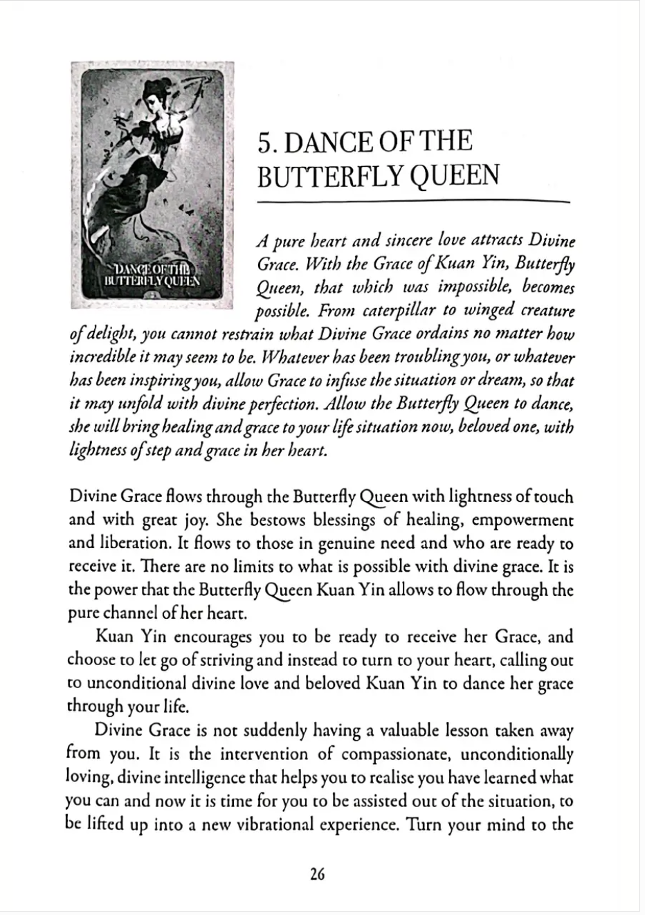 Divine Grace flows through the Butterfly Queen with lightness of touch and with great joy. She bestows blessings of healing, empowerment and liberation. It flows to those in genuine need and who are ready to receive it. There are no limits to what is possible with divine grace. It is the power that the Butterfly Queen Kuan Yin allows to flow through the pure channel of her heart. Kuan Yin encourages you to be ready to receive her Grace, and choose to let go of striving and instead to turn to your heart, calling out to unconditional divine love and beloved Kuan Yin to dance her grace through your life.