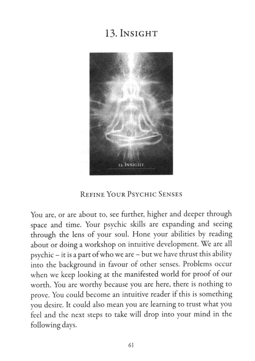 Place a hand on the card. Slow your breathing and feel into your inner world, perhaps your heart, your belly or the very center of yourself. Here is a point of light that represents the qualities of your soul. Focus on this point of light and imagine it growing larger and larger in your inner world. Now, direct your light to your third eye. Imagine you have curtains over your inner eye that you can open and close at will. See the curtains open and allow the light you are directing to flow into your third eye. Follow the light as it moves through the gateway of your inner knowing. Allow yourself to move deeper into your wisdom. Become peaceful and quiet. From this stillness, be open to the layers of wisdom that flow from your soul and this card. Stay here for at least one minute. When you feel ready, focus on your physical body and breathe your soul wisdom into your life. Close the curtains over your third eye and open your physical eyes when you feel ready.