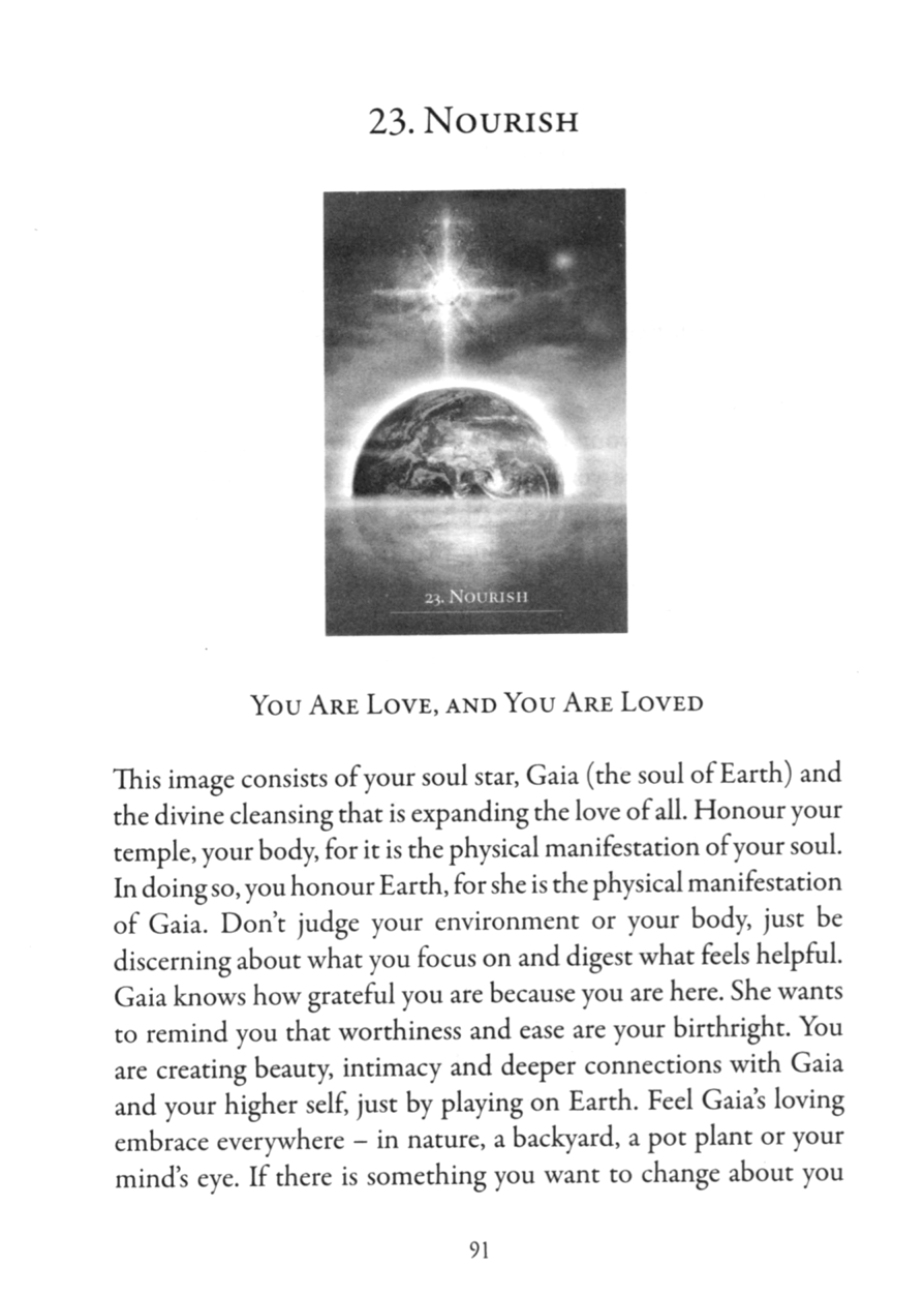 This image consists of your soul star, Gaia (the soul of Earth) and the divine cleansing that is expanding the love of all. Honour your temple, your body, for it is the physical manifestation of your soul. In doing so, you honour Earth, for she is the physical manifestation of Gaia. Don’t judge your environment or your body, just be discerning about what you focus on and digest what feels helpful. Gaia knows how grateful you are because you are here. She wants to remind you that worthiness and ease are your birthright. You are creating beauty, intimacy and deeper connections with Gaia and your higher self, just by playing on Earth. Feel Gaia’s loving embrace everywhere – in nature, a backyard, a pot plant or your mind’s eye. If there is something you want to change about you or Gaia’s body, connect with your soul and be inspired by a new path that will lead you to your desire. On this planet, all is forever moving into more and more love.