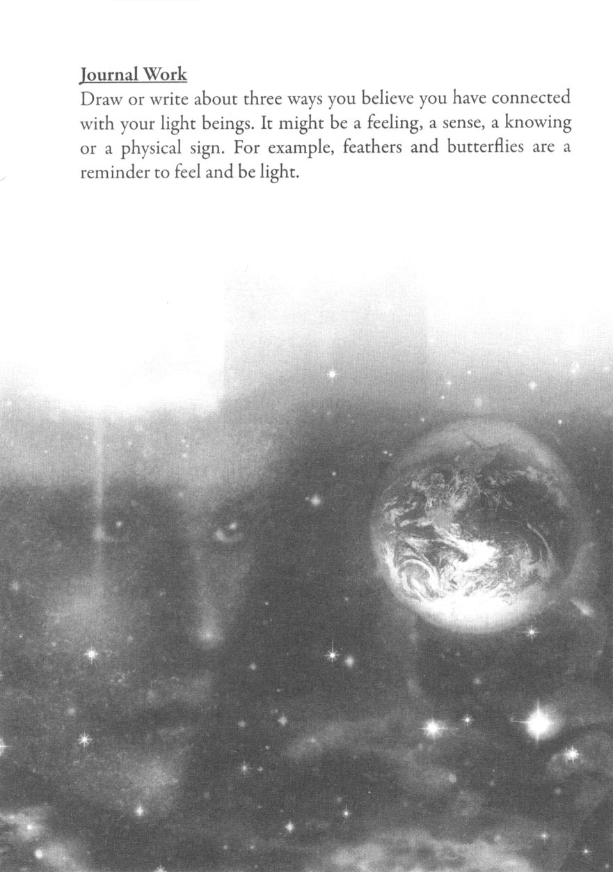 Draw or write about three ways you believe you have connected with your light beings. It might be a feeling, a sense, a knowing or a physical sign. For example, feathers and butterflies are a reminder to feel and be light.