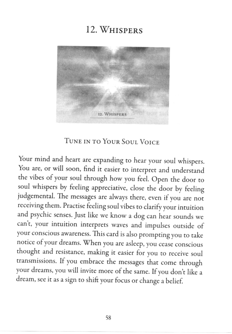 Your mind and heart are expanding to hear your soul whispers. You are, or will soon, find it easier to interpret and understand the vibes of your soul through how you feel. Open the door to soul whispers by feeling appreciative, close the door by feeling judgmental. The messages are always there, even if you are not receiving them. Practice feeling soul vibes to clarify your intuition and psychic senses. Just like we know a dog can hear sounds we can’t, your intuition interprets waves and impulses outside of your conscious awareness. This card is also prompting you to take notice of your dreams. When you are asleep, you cease conscious thought and resistance, making it easier for you to receive soul transmissions. If you embrace the messages that come through your dreams, you will invite more of the same. If you don't like a dream, see it as a sign to shift your focus or change a belief.