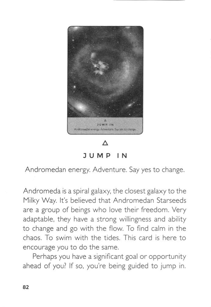 Andromedan energy. Adventure. Say yes to change. Andromeda is a spiral galaxy, the closest galaxy to the Milky Way. It’s believed that Andromedan Starseeds are a group of beings who love their freedom. Very adaptable, they have a strong willingness and ability to change and go with the flow. To find calm in the chaos. To swim with the tides. This card is here to encourage you to do the same. Perhaps you have a significant goal or opportunity ahead of you? If so, you’re being guided to jump in. Don’t wait for permission. Don’t stall until you feel ready. Take a deep breath, a good old run up, and jump right on in. Life bends for the courageous, and courageous is what you’re being called to be. You’re already facing the right direction – the only thing left to do is leap. You’ll figure out the details as you go along. Things may not always be smooth sailing – life on Earth rarely is. However, it’s the rougher seas that teach us how to sail with glory, and once you know that, you can navigate any sea, ocean, or storm. The Andromedans want you to fall in love with surfing the waves of life. To seek more adventures. To embrace your own adaptability and find a way to be the calm in the chaos. You didn’t come to Earth to be passive. You came to Earth to truly live. Now, take a good run up and leap.