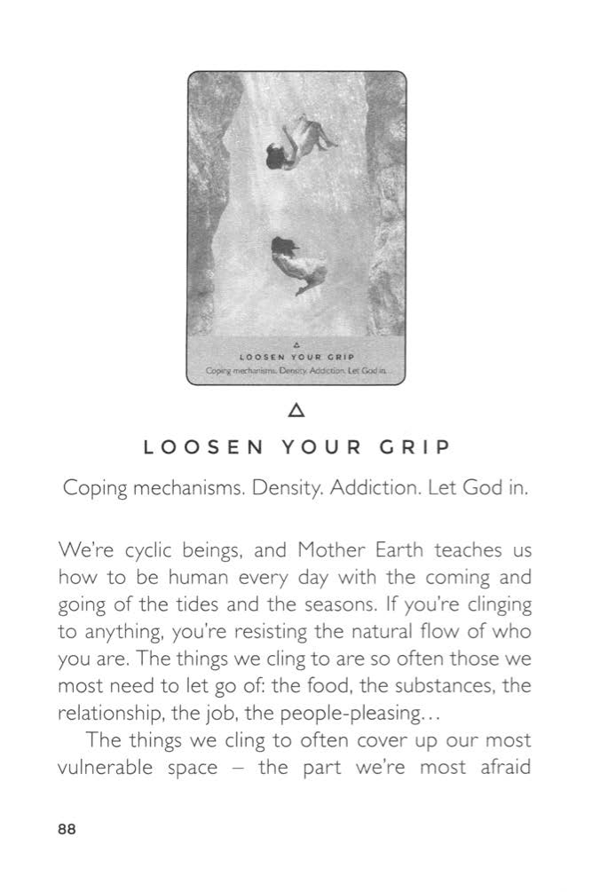 Coping mechanisms. Density. Addiction. Let God in. We're cyclic beings, and Mother Earth teaches us how to be human every day with the coming and going of the tides and the seasons. If you're clinging to anything, you're resisting the natural flow of who you are. The things we cling to are so often those we most need to let go of: the food, the substances, the relationship, the job, the people-pleasing... The things we cling to often cover up our most vulnerable space — the part we're most afraid to leave empty; the part we guard and don’t let grace into. But by keeping that space covered with something that doesn’t serve us, or clinging to it for fear of it not staying of its own accord, we prevent ourselves from receiving the things that will. A Course in Miracles tells us: 'Whatever we leave empty, grace will fill.' And the Buddha said: 'You can only lose what you cling to.' Indeed, both are true. If this card appears, you’re being called to find the courage to loosen your grip and give up control. To release your coping mechanisms and leave space for grace and God to enter. To surrender all that feels dense to the divine. Loosening your grip doesn’t mean that what you’re clinging to will go away. It may. Or it might stay. But you can be sure that what is for you, will find you. And you’ll breathe easier knowing that you’ve shifted from relying on your own strength to surrendering to the grace of life.