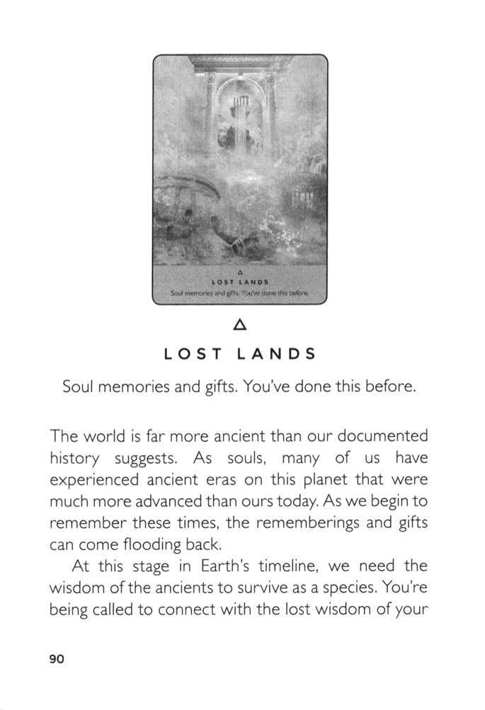 영혼에 새겨진 기억과 선물들. 당신은 이미 이 길을 걸어본 적이 있습니다. 우리의 문헌에 기록된 역사보다 세상은 훨씬 더 오래됐습니다. 많은 이들의 영혼은 오늘날보다 훨씬 더 발전된 이 행성의 고대 시대를 경험했습니다. 이러한 때를 다시 기억하기 시작할 때, 그 기억과 선물들은 물밀듯 다시 찾아옵니다. 지구의 시간축에서 이 시점에 우리는 고대의 지혜가 생존에 필요합니다. 당신의 영혼 깊은 곳에 잠들어 있는 잃어버린 지혜와 연결되라는 부름을 받고 있습니다. 인생에 변화를 주고 싶다면 — 새로운 직업 경로를 찾고, 창조를 탄생시키고, 아이디어를 현실로 가져오고 싶다면 — 그러나 준비되지 않았다고 느낀다면, 이 카드는 이미 당신이 그것을 해본 적이 있을 것이라고 당신을 부르고 있습니다. 어쩌면 당신의 영혼은 당신이 상상할 수 없는 지혜를 간직하고 있을지도 모릅니다. 받는 직감과 아이디어들이 신의 인도로 오는 것일지도 모릅니다. 어쩌면 당신은 이 시기를 준비해 온 것일지도 모릅니다. 잃어버린 땅을 과거의 일로 여기는 이들도 있지만, 오늘날 다른 차원에 존재한다고 믿는 이들도 있습니다. 저는 그런 고대의 땅들이 경험한 이들의 영혼 속에도 존재한다고 믿습니다. 이 카드가 당신에게 왔다면, 어쩌면 당신 안에 레무리아, 아틀란티스, 아발론과 같은 잃어버린 땅의 지혜가 깃들어 있을지도 모릅니다. 당신의 영혼의 지성에 맡김으로써 우리는 이러한 고대의 씨앗들을 깨울 수 있고, 우리의 실수에서 배우며 새로운 시대를 맞이할 수 있습니다.
