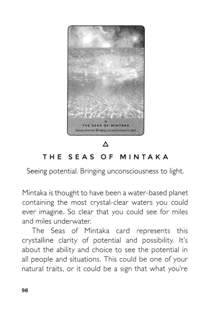 The Seas of Mintaka card represents this crystalline clarity of potential and possibility. It's about the ability and choice to see the potential in all people and situations. This could be one of your natural traits, or it could be a sign that what you're currently doing has great potential. Mintakans are thought to have been a galactic race who saw the light in everything and everyone.